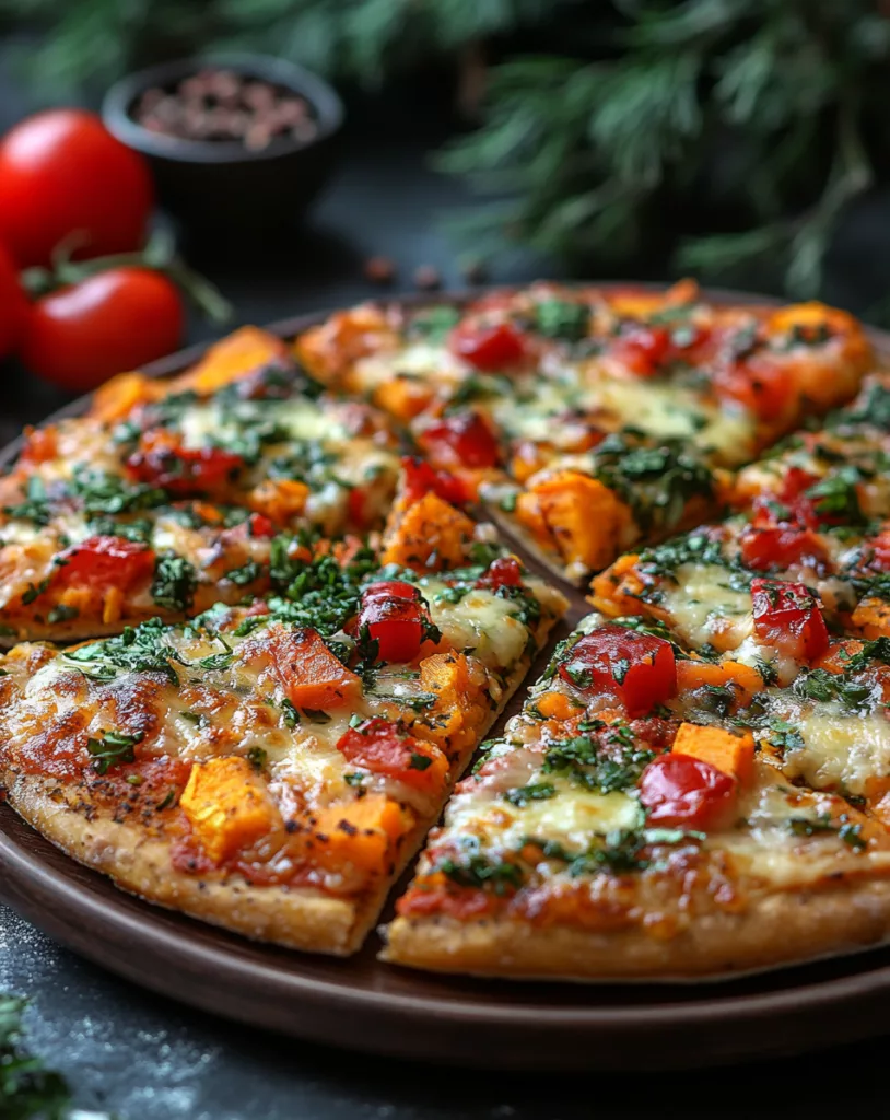 Pizza mal anders! Diese Süßkartoffel-Pizza vereint die herrliche Süße der Süßkartoffel mit herzhaften Belägen wie Tomatensoße, frischem Gemüse und geschmolzenem veganem Käse. Das Besondere? Der Boden wird aus einer Mischung von Süßkartoffeln und Hafermehl zubereitet – eine glutenfreie und nährstoffreiche Alternative zum klassischen Pizzateig.